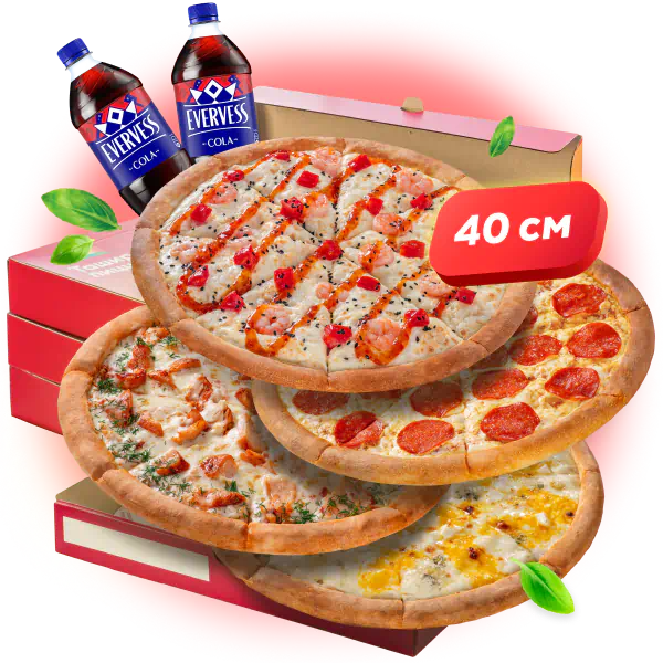 - 4 пиццы 40 см: Пепперони, Венеция, С креветками и кисло-сладким соусом, Пять сыров + 2 напитка: Эвервесс Кола 1 л
